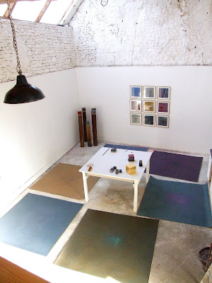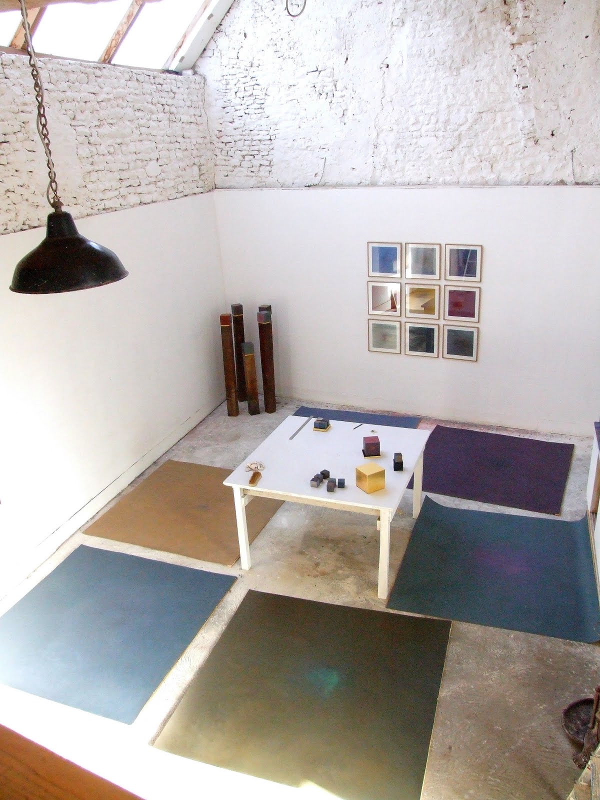 Huiles sur papier, pastels, cubes peints, feuille d’or. Atelier, septembre 2010