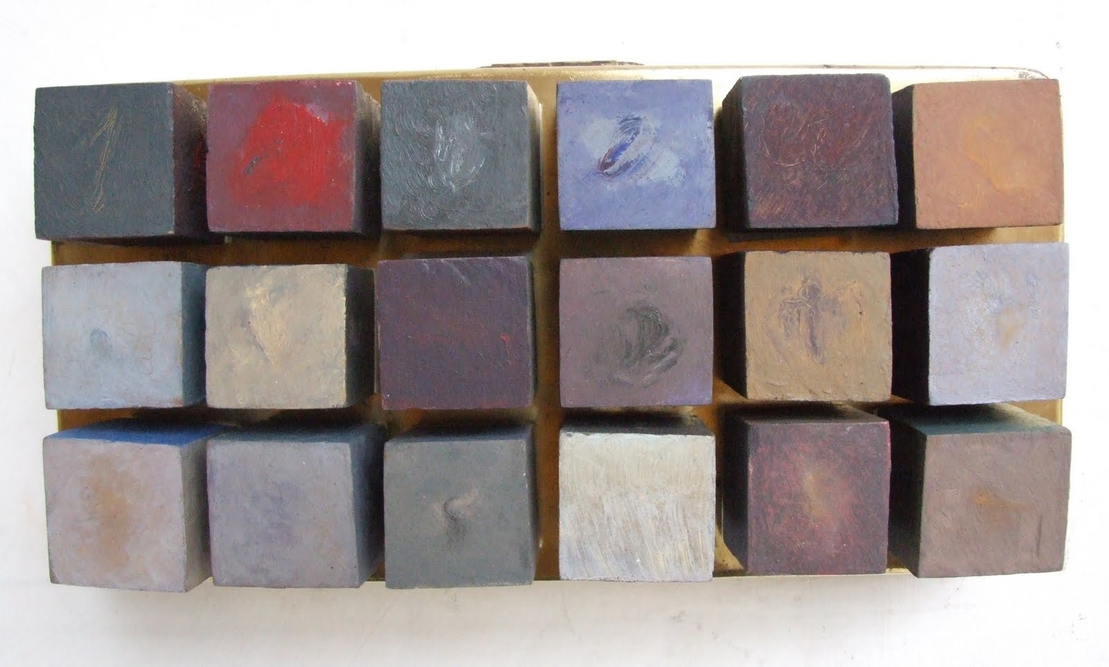 Ensemble de 18 cubes sur boîte en cuivre, huile sur bois. 40 cm x 20 cm x 12 cm. 2010